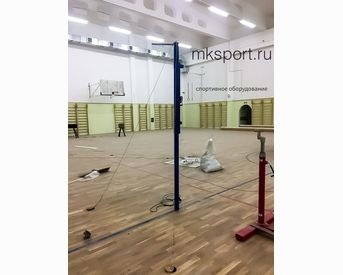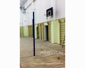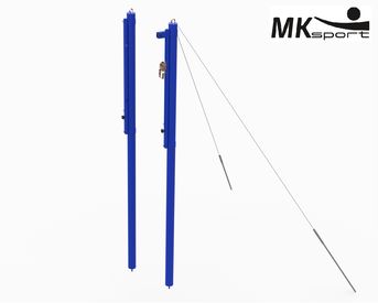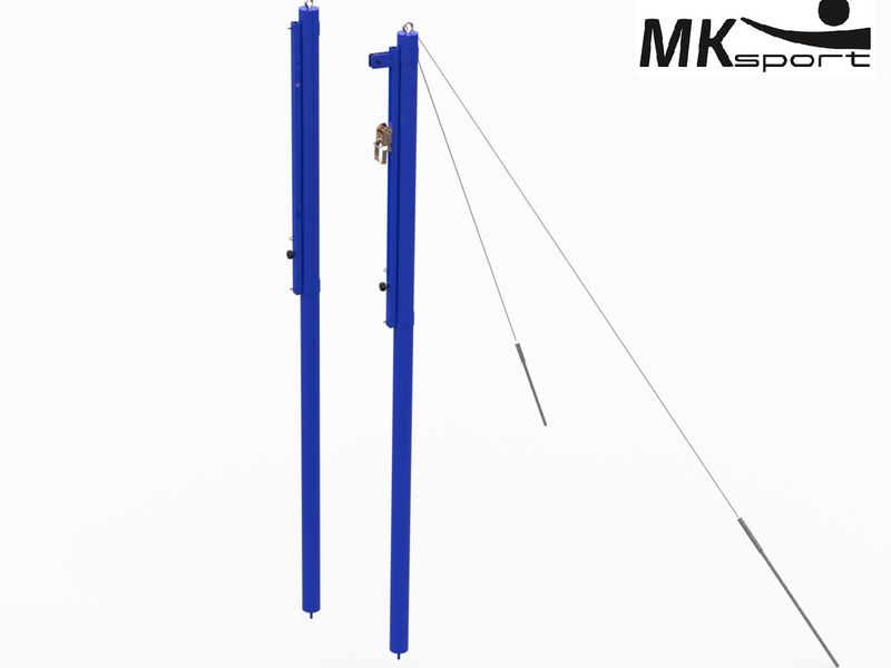 Стойки предназначены для крепления сетки и снаряжения площадки для проведения волейбольных матчей. Конструкция представляет собой пару стоек, установка которых производится при помощи растяжек. Стойки В-01 выполнены из круглой трубы 76*3 мм и оборудованы четырьмя растяжками, натяжение которых обеспечивается талрепами. Фиксация сетки осуществляется с помощью бегунков, изготовленных из профиля 40*25*2 мм. Стандартный цвет стоек синий.